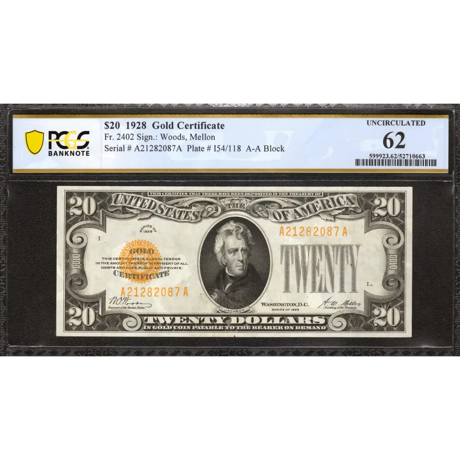 1928 $20 GOLD CERTIFICATE FR.2402 WOODS MELLON , AA BLOCK | PCGS CERTIFIED 62 UNCIRCULATED