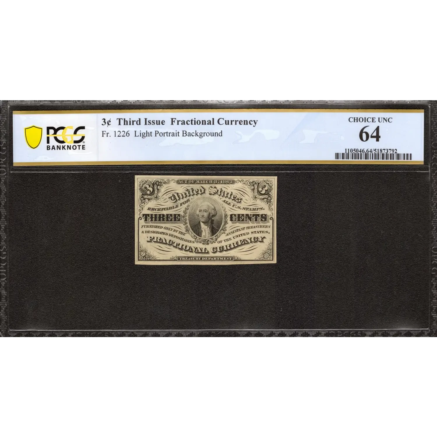 THIRD ISSUE 3C FRACTIONAL CURRENCY FR.1226 LIGHT PORTRAIT BACKGROUND | PCGS CERTIFIED CU 64 CHOICE UNCIRCULATED