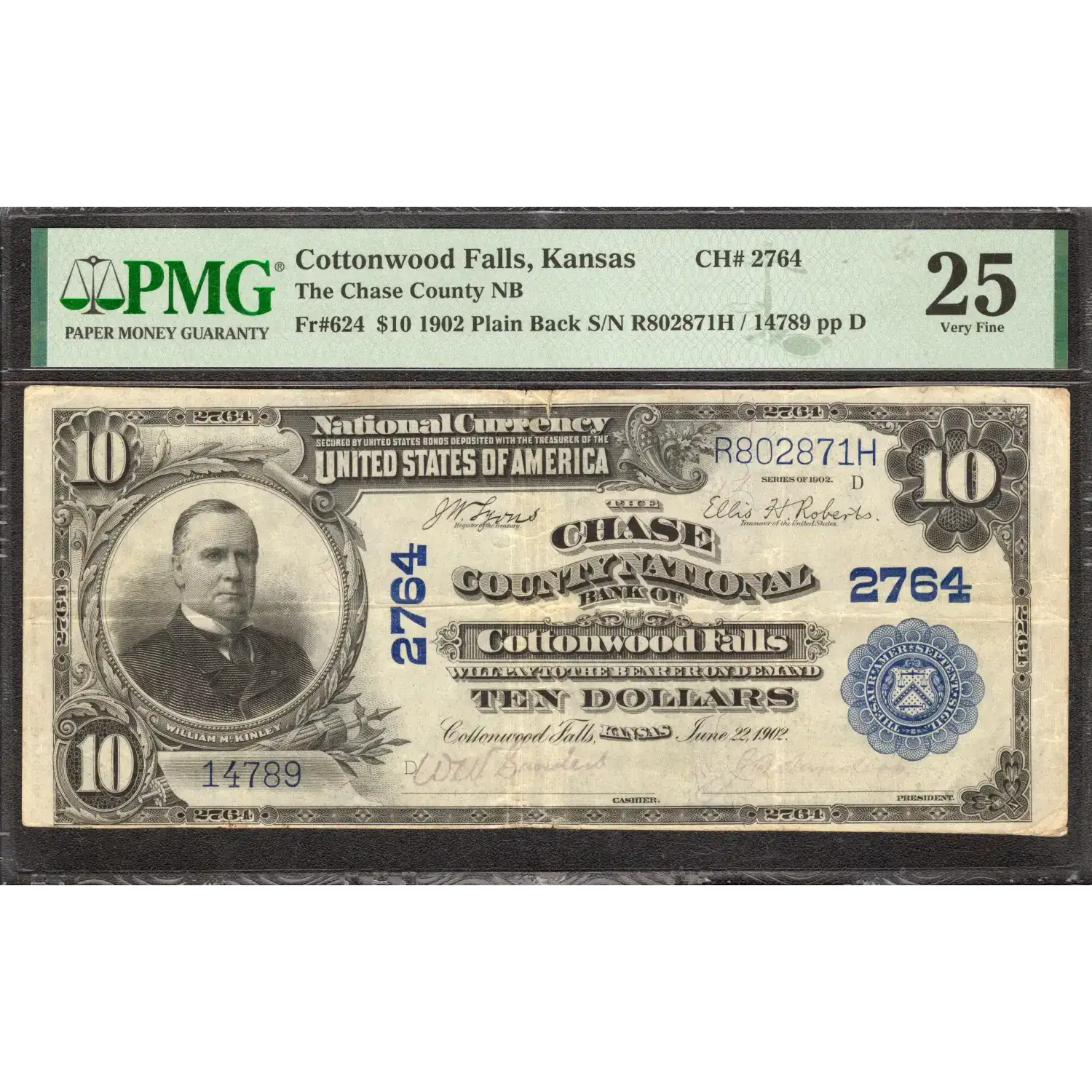 1902 $10 CHASE COUNTY NATIONAL BANK NOTE CURRENCY FR.624 COTTONWOOD FALLS KANSAS | PMG CERTIFIED VF 25 VERY FINE