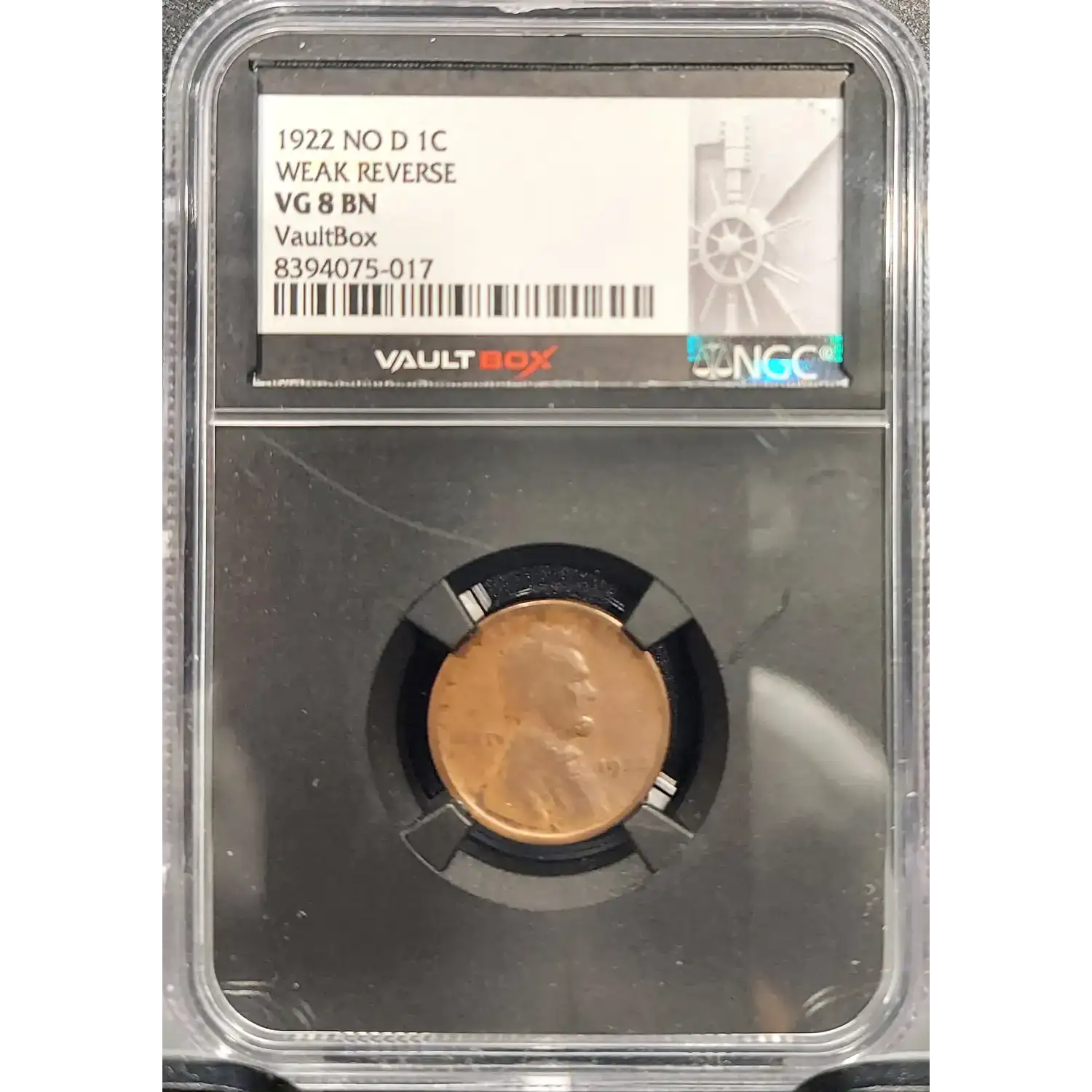 <header> 1922 D LINCOLN WHEAT CENT 1C WEAK REVERSE NGC CERTIFIED VG 08 BN VERY GOOD , BROWN | NO D DENVER | VAULT BOX