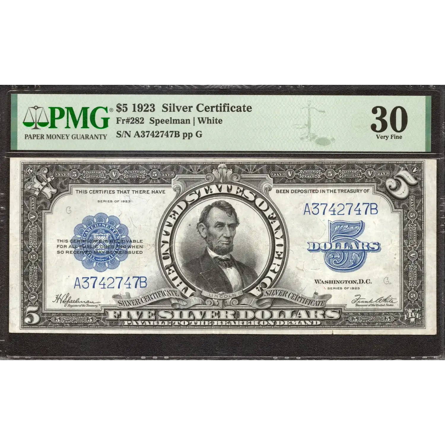 1923 $5 SILVER CERTIFICATE FR.282 A-B BLOCK , SPEELMAN WHITE | PMG CERTIFIED VF 30 VERY FINE