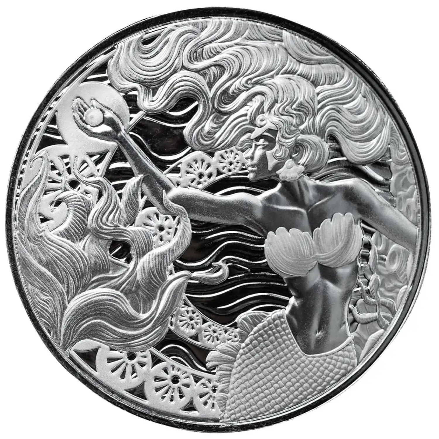 The mermaid, a timeless symbol of mystery and allure, is elegantly depicted on the obverse side of the coin, showcasing intricate details that highlight the artistry of the mint. The reverse side features the serene beauty of a pearl, set against a backdrop of oceanic elements, embodying the allure and depth of the sea. The combination of artistry and silver purity makes this coin a true treasure for enthusiasts of numismatics and those who appreciate marine mythology.