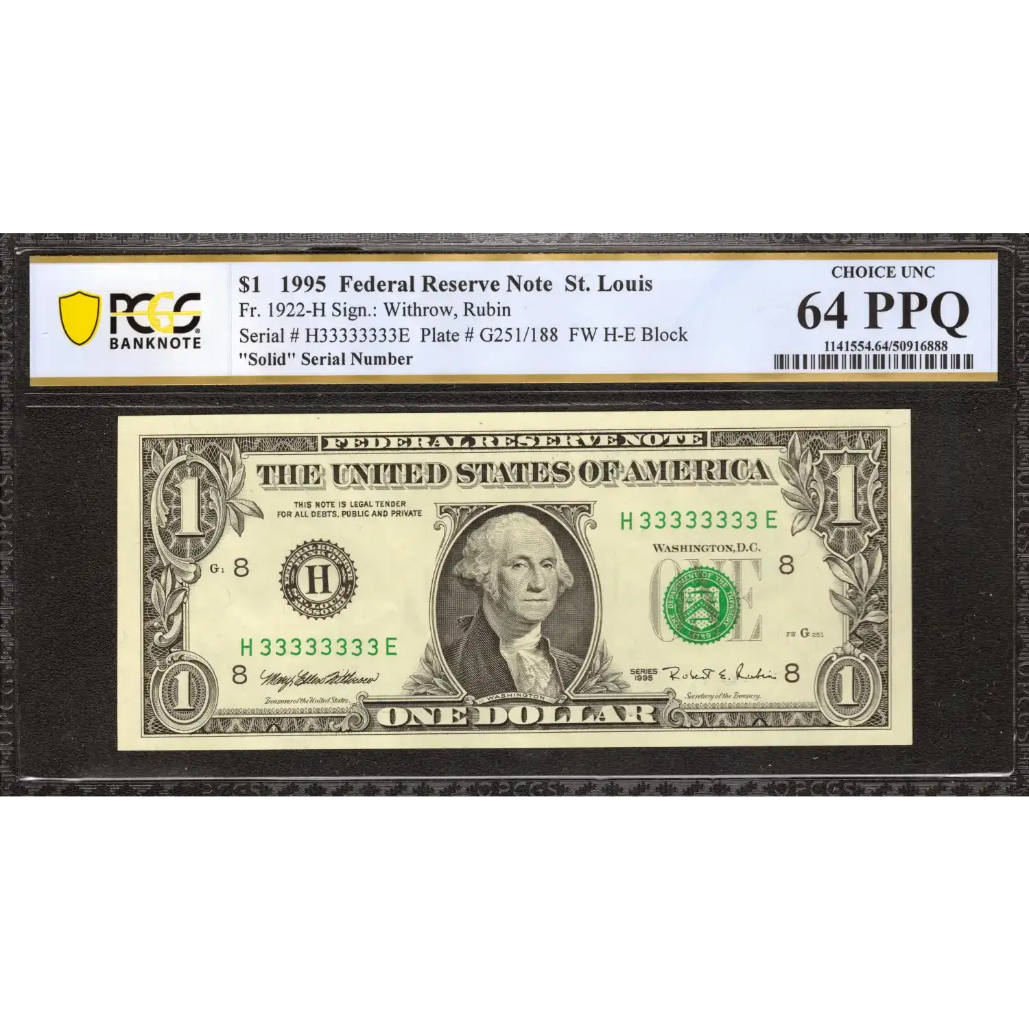1995 $1 FEDERAL RESERVE NOTE ST LOUIS FR.1922-H FW HE BLOCK | PCGS CERTIFIED CU 64 CHOICE UNCIRCULATED - PPQ PREMIUM PAPER QUALITY | SOLID SERIAL NUMBER "333"