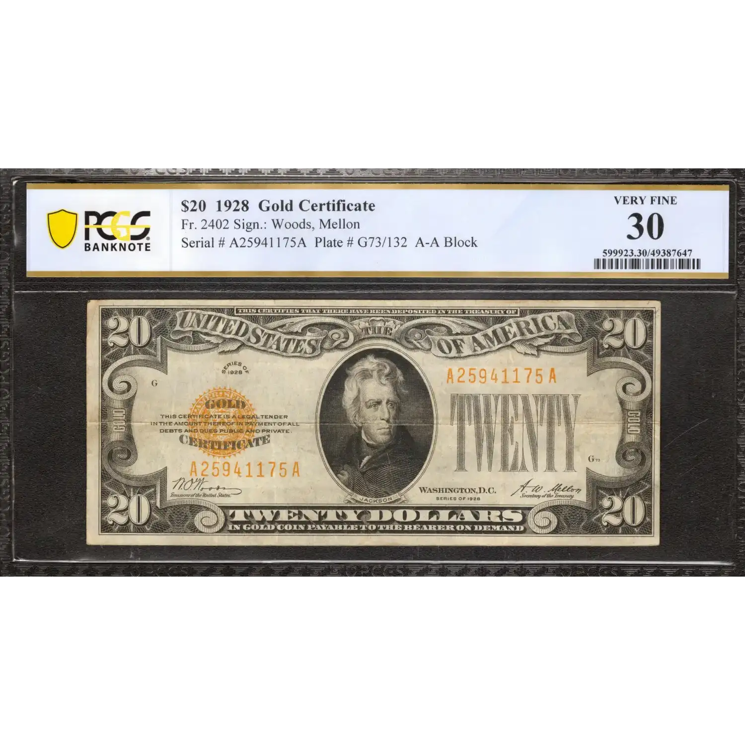 1928 $20 GOLD CERTIFICATE FR.2402 WOODS MELLON AA BLOCK | PCGS CERTIFIED VF 30 VERY FINE
