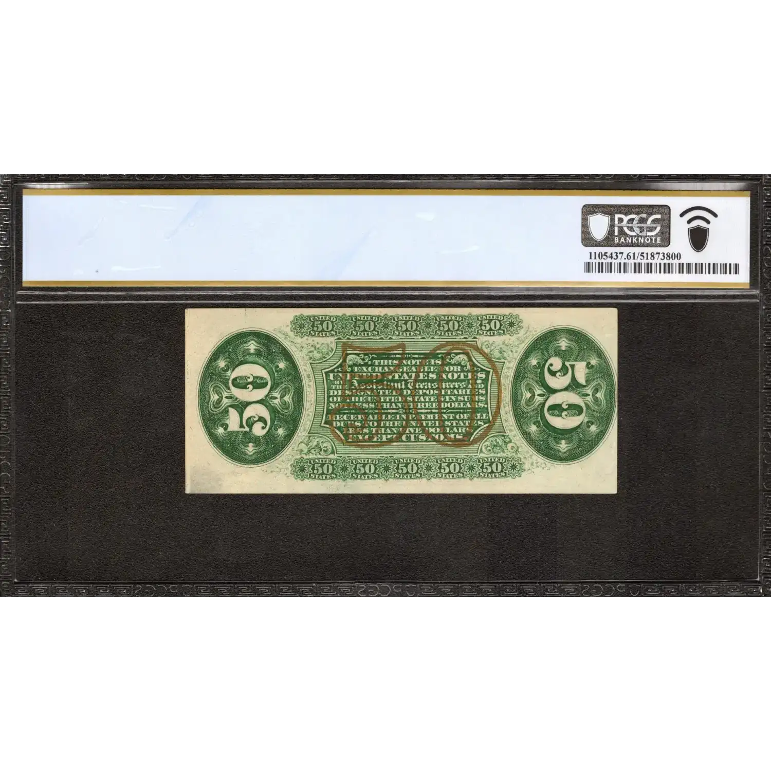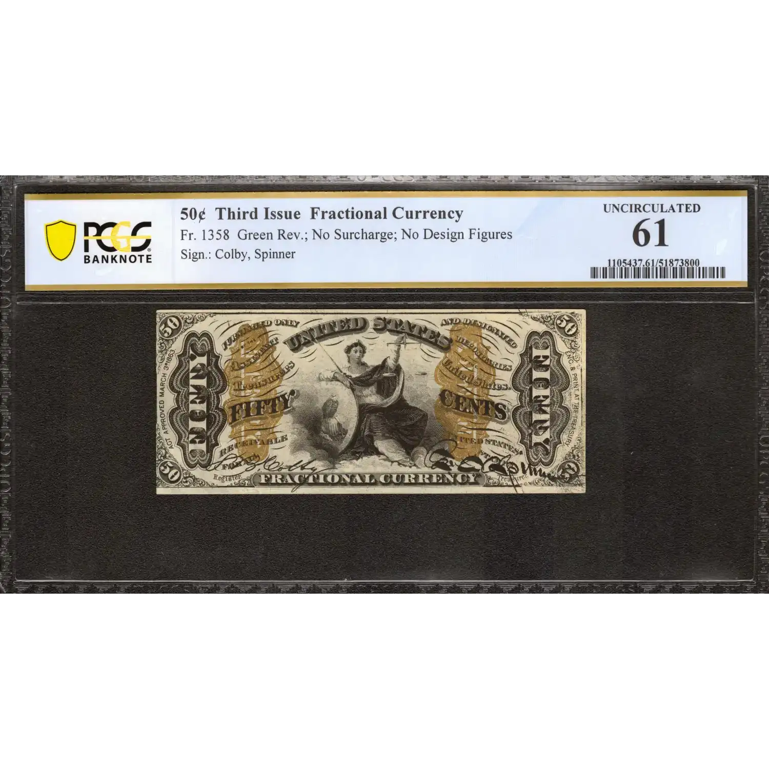THIRD ISSUE 50C FRACTIONAL CURRENCY FR.1358 GREEN REVERSE , NO SURCHARGE , NO DESIGN FIGURES | PCGS CERTIFIED 61 UNCIRCULATED