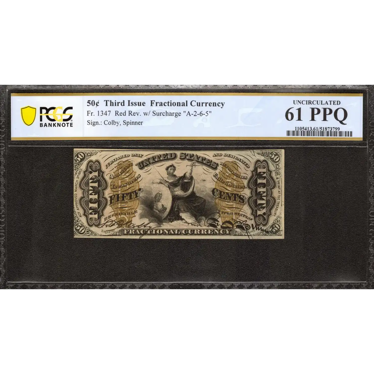 THIRD ISSUE 50C FRACTIONAL CURRENCY FR.1347 RED REVERSE W/ SURCHARGE A-2-6-5 | PCGS CERTIFIED 61 UNCIRCULATED - PPQ PREMIUM PAPER QUALITY