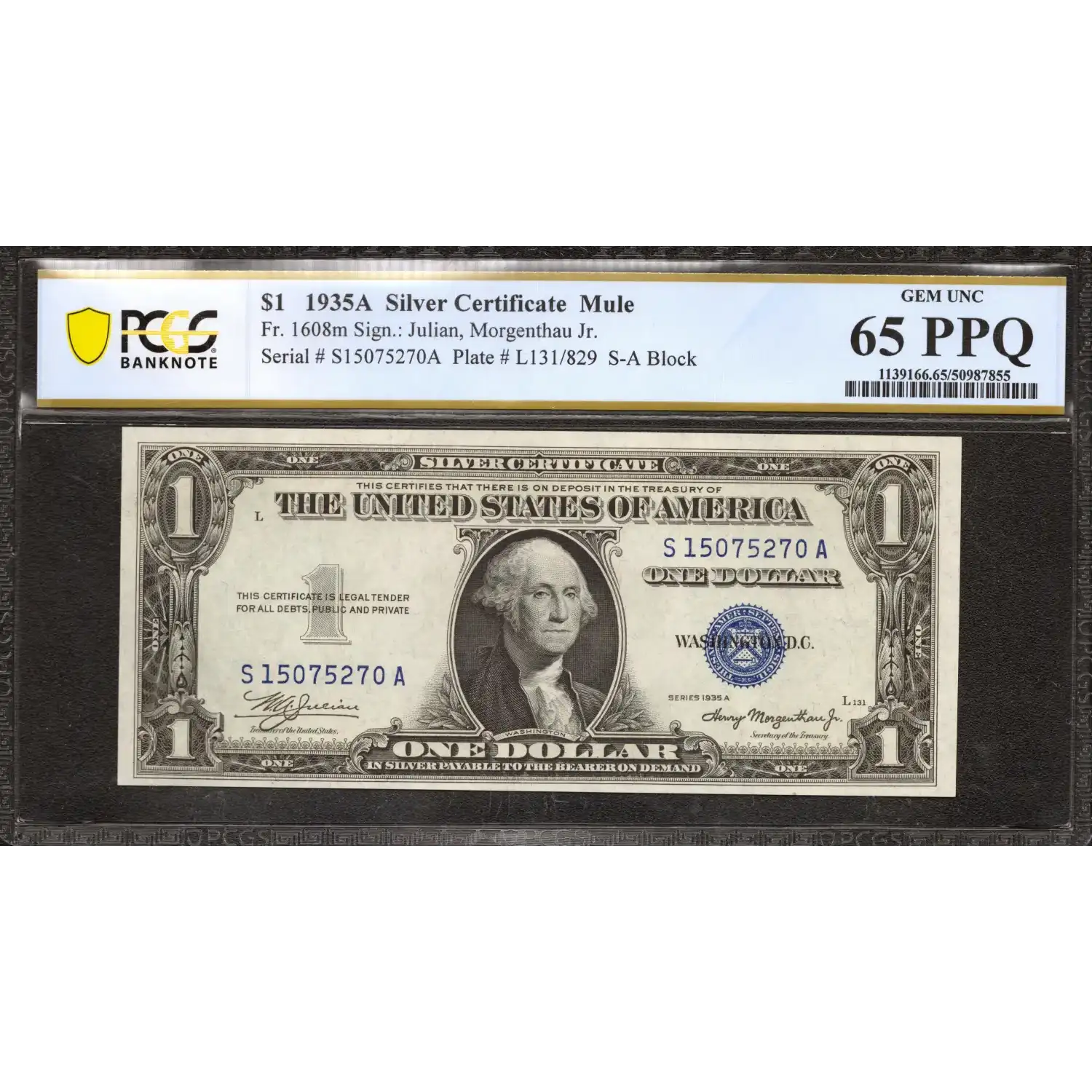 1935 A $1 SILVER CERTIFICATE FR.1608m MULE S-A BLOCK , JULIAN MORGENTHAU JR | PCGS CERTIFIED 65 GEM UNCIRCULATED - PPQ PREMIUM PAPER QUALITY