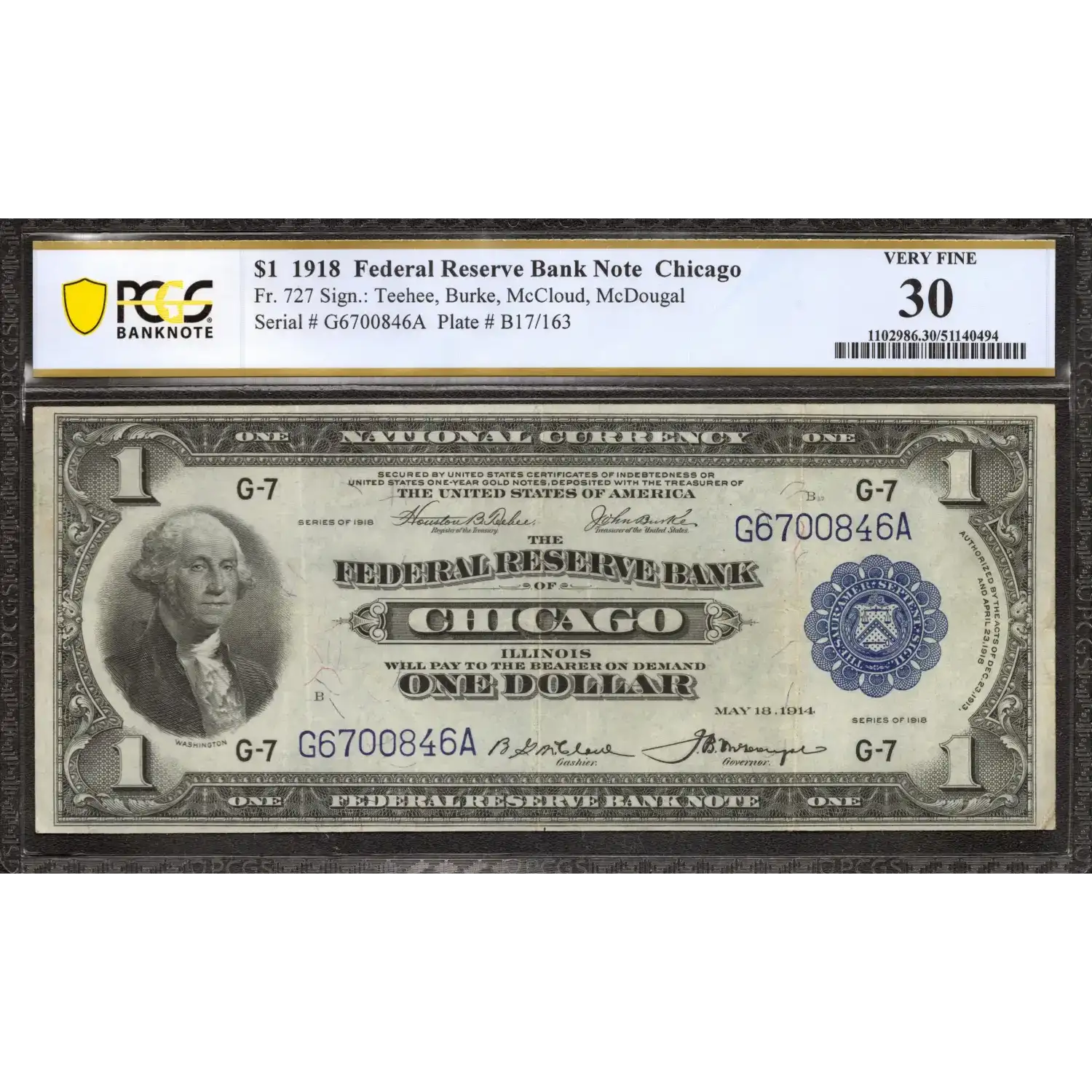 1918 $1 FEDERAL RESERVE BANK NOTE CURRENCY FR.727 CHICAGO ILLINOIS | PCGS CERTIFIED VF 30 VERY FINE