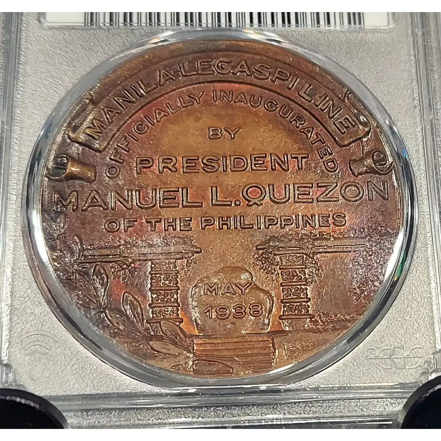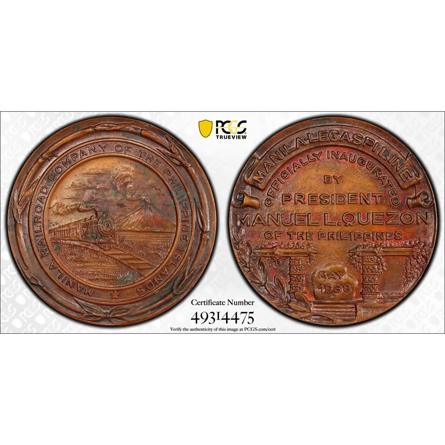 <header> 1938 PHILIPPINES MANILA RAILROAD COMPANY MEDAL HONEYCUTT-289 BASSO-839 AE | PCGS CERTIFIED GENUINE UNCIRCULATED | DETAIL - ENVIRONMENTAL DAMAGE