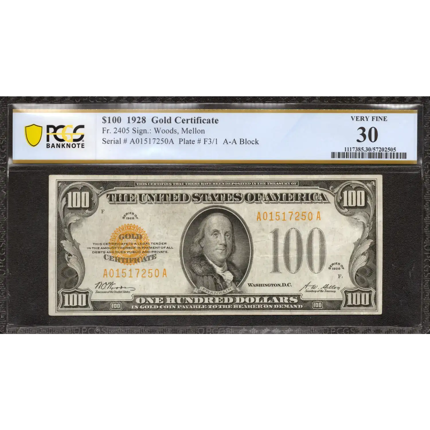 1928 $100 GOLD CERTIFICATE FR.2405 A-A BLOCK , WOODS MELLON | PCGS CERTIFIED VF 30 VERY FINE