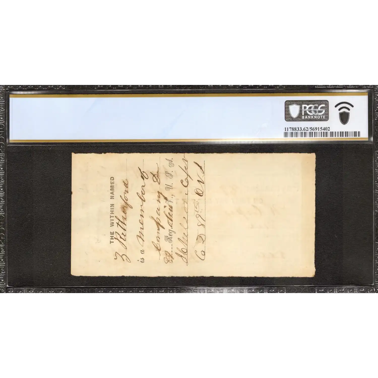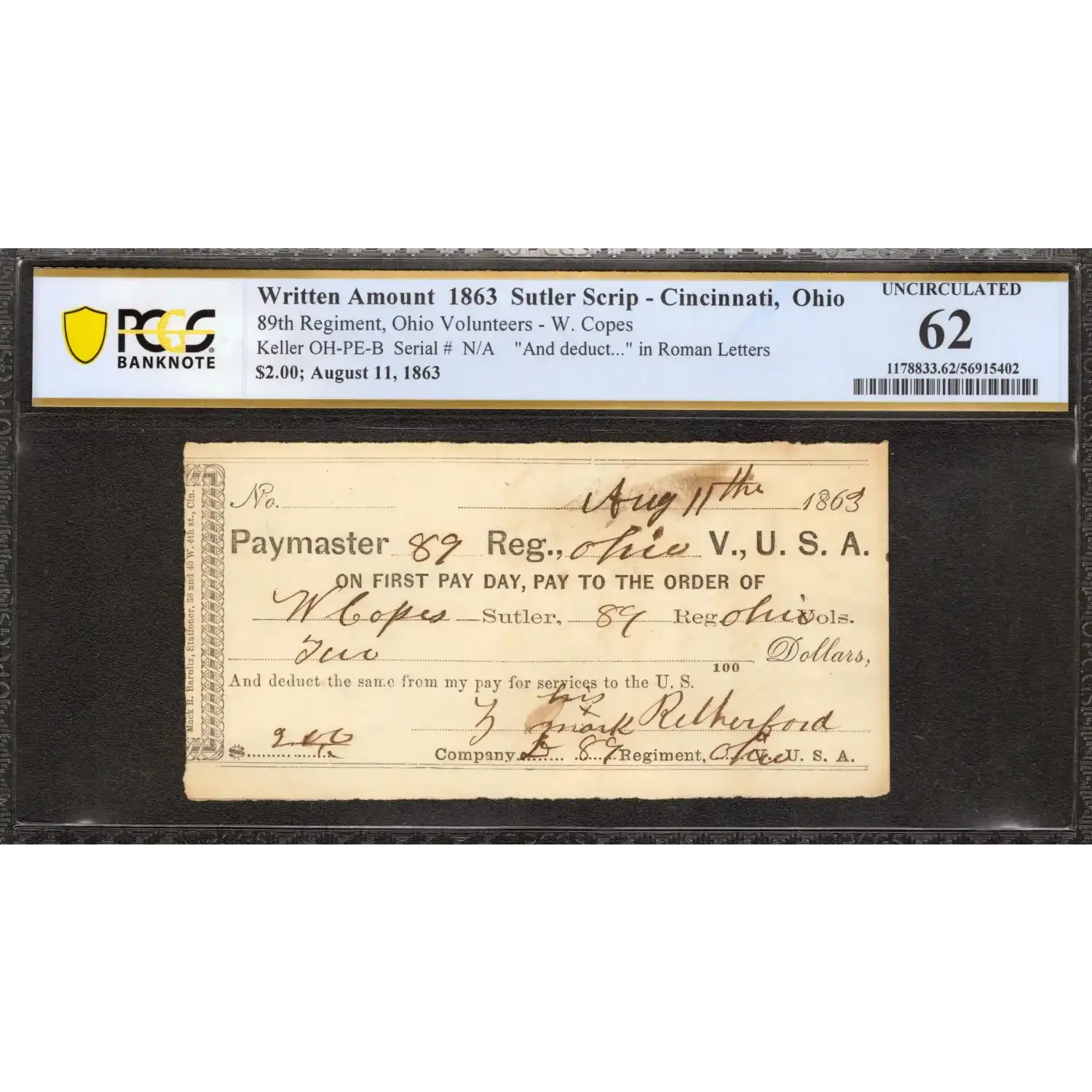 WRITTEN AMOUNT 1863 SUTLER SCRIP CINCINNATI OHIO NOTE $2 KELLER OH-PE-B | 89TH REGIMENT , OHIO VOLUNTEERS , W COPES | PCGS CERTIFIED 62 UNCIRCULATED